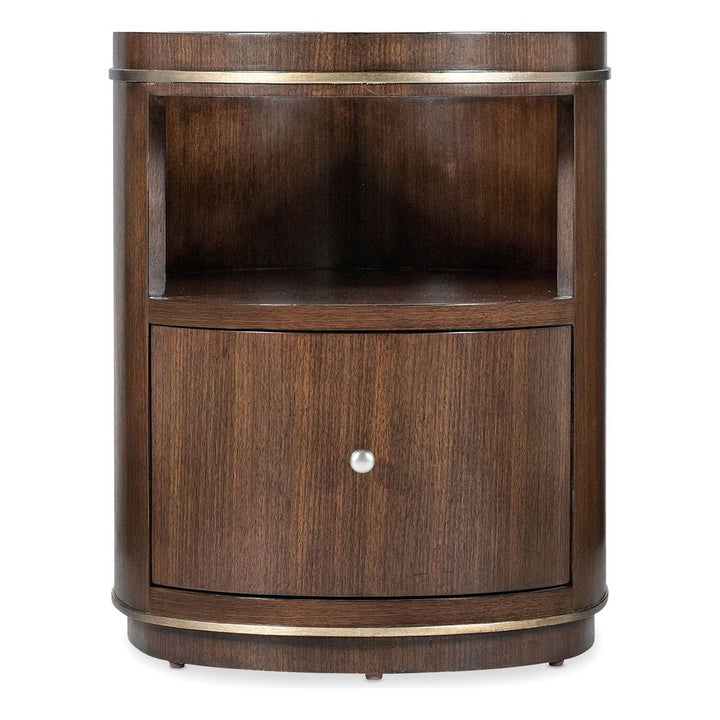 Description: Classy and timeless, the Contours Side Table combines Walnut Veneer, champagne accent trim and a white tempered and beveled glass insert. In a pleasing oval shape, it has one drawer and an open space above the drawer and a champagne-finished round knob. At only 19.5 inches wide and 27.5 inches deep, it will fit easily in even tight spaces.