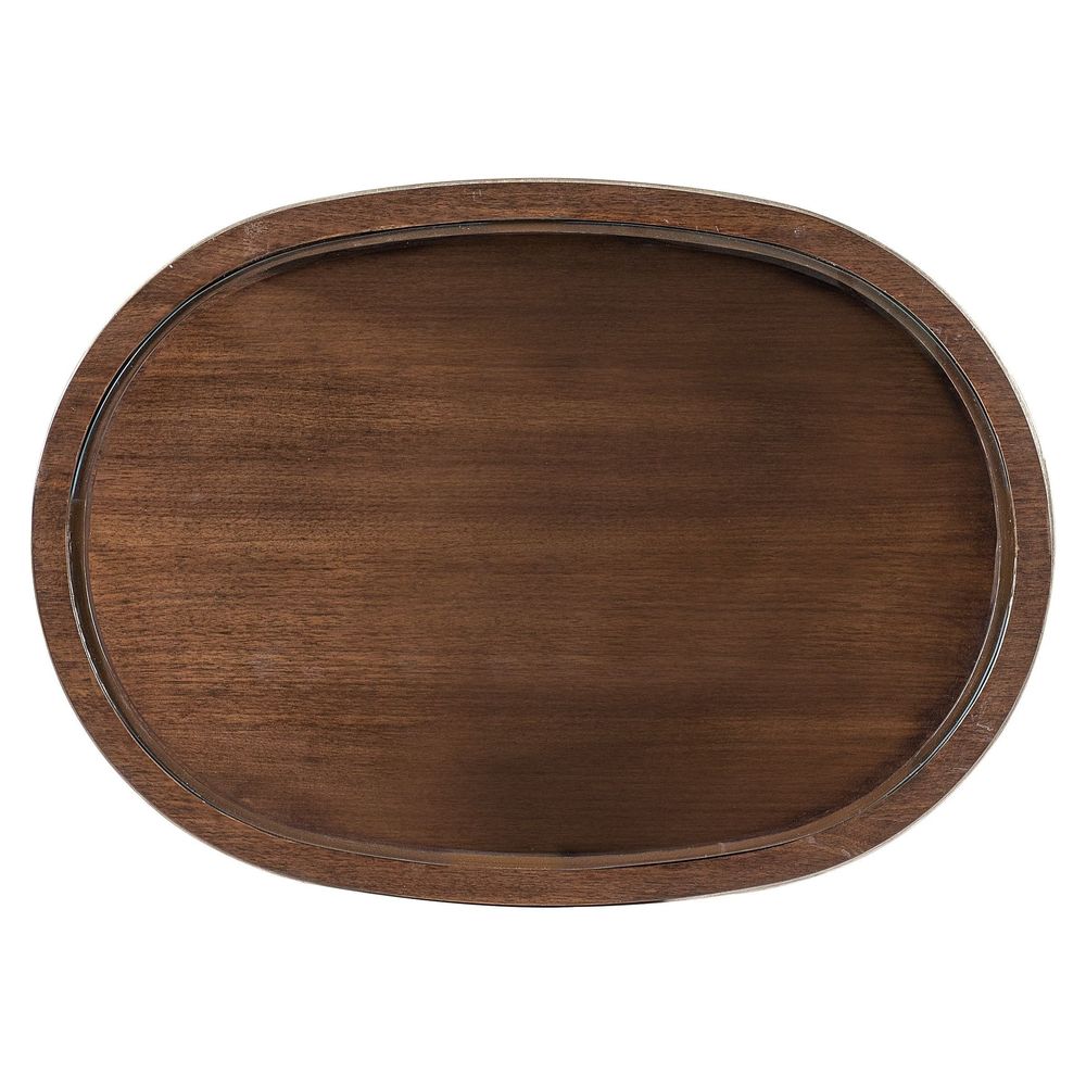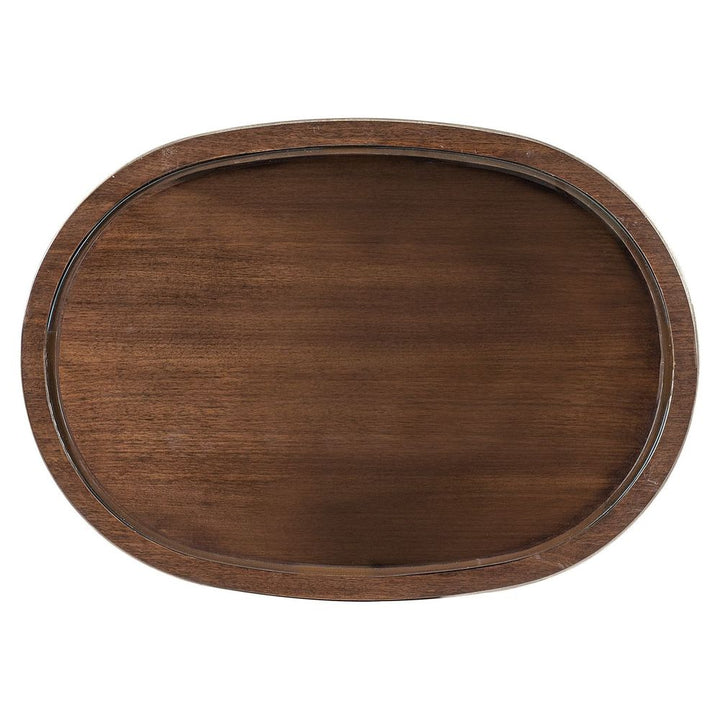 Features: Wood framed top with tempered, beveled glass insert; One drawer; Open space above drawer; Oval shape; Champagne accent trim