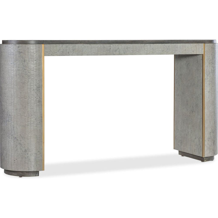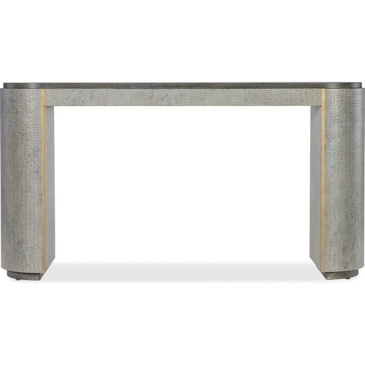Description: With the design flair of a luxurious fashion accessory, the Dylian Console Table has a gray crocodile exterior with gold metal accents and a dark wood top and base. Crafted of Pine Veneers and Robus Leather, it has an oval shape and measures 64 inches wide by 16 inches deep.