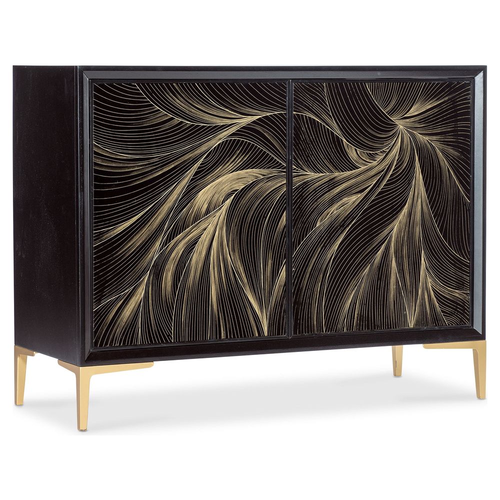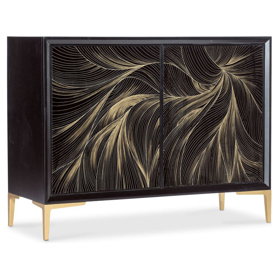 Description: The gold abstract willow motif on the glass-painted door fronts contrasts with the black finished exterior, giving a tropical yet sleek feel to the Willow Hall Chest. Crafted of Maple Veneer, the chest has slender gold metal legs. Behind the two touch-latch doors with soft-close hinges is one adjustable shelf.
