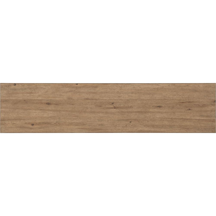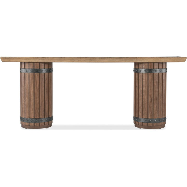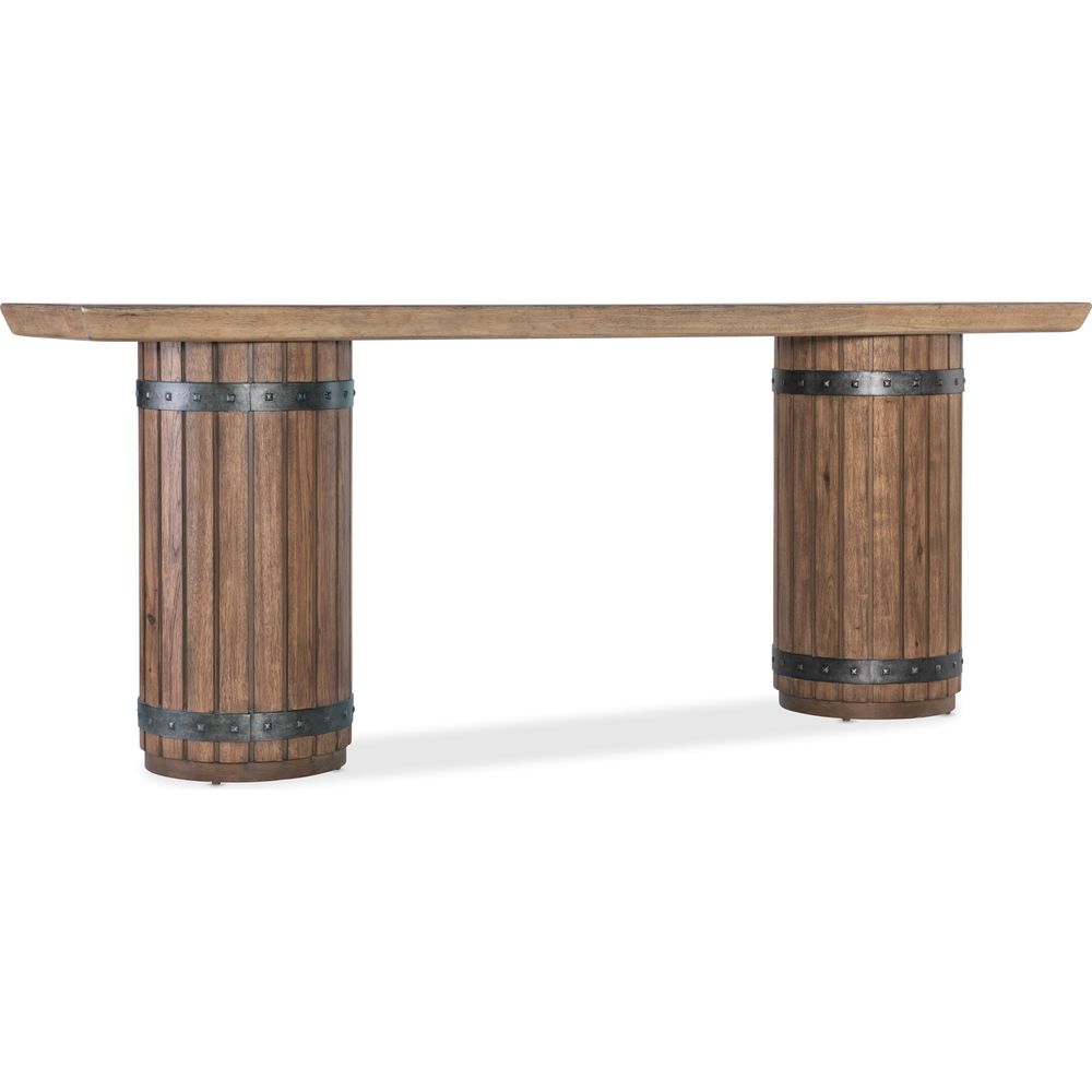 Description: Capture the essence of the Napa Valley lifestyle with the Vineyard Row Console Table. Measuring 86 inches wide by 20 inches deep, the table has rustic wine barrel-influenced pedestal bases and hammered metal accents. Crafted of Pecky Hickory Veneers with resin, the top is finished in the light and airy Sonoma tone, and the base is in Napa, a darker tone inspired by the red wines of the Napa Valley