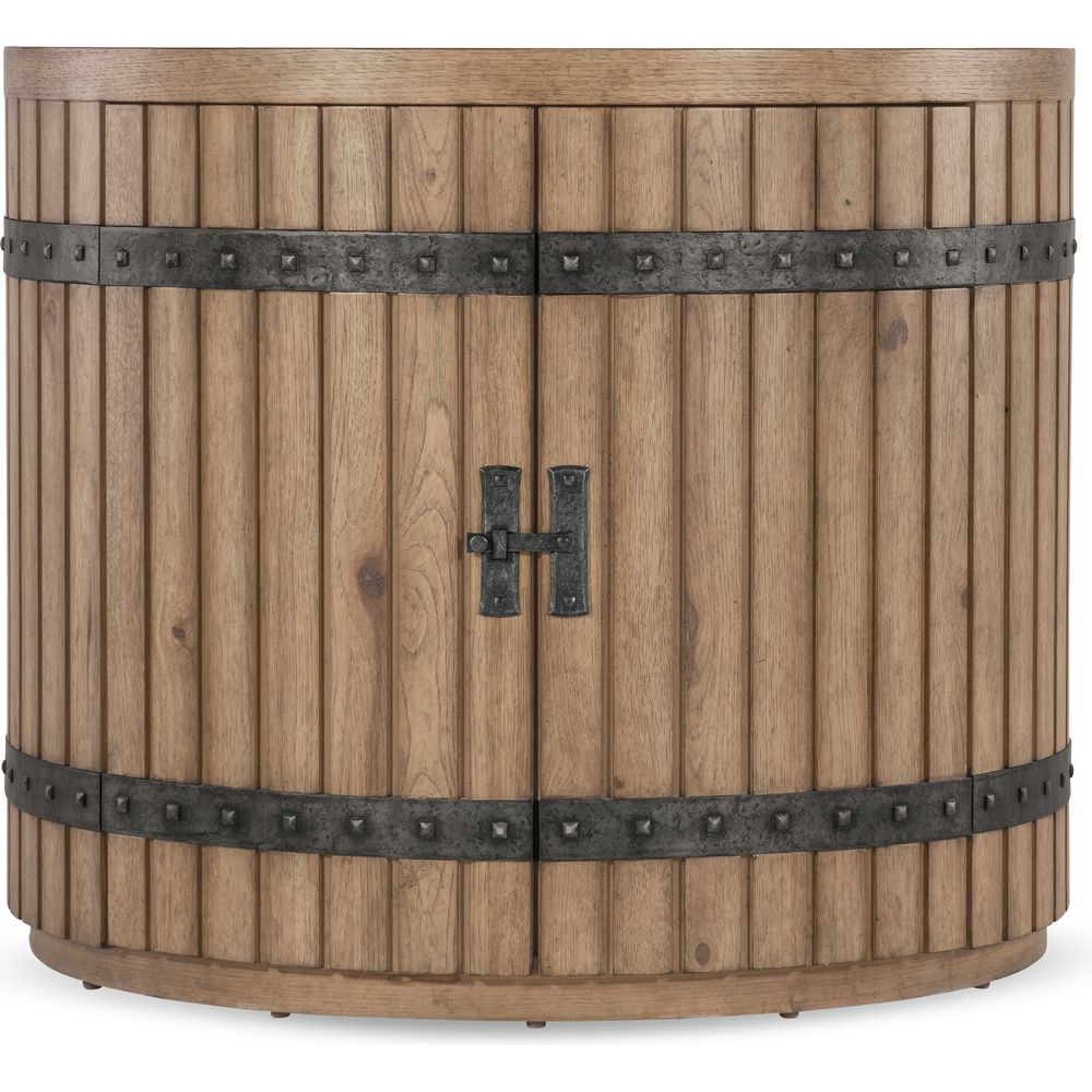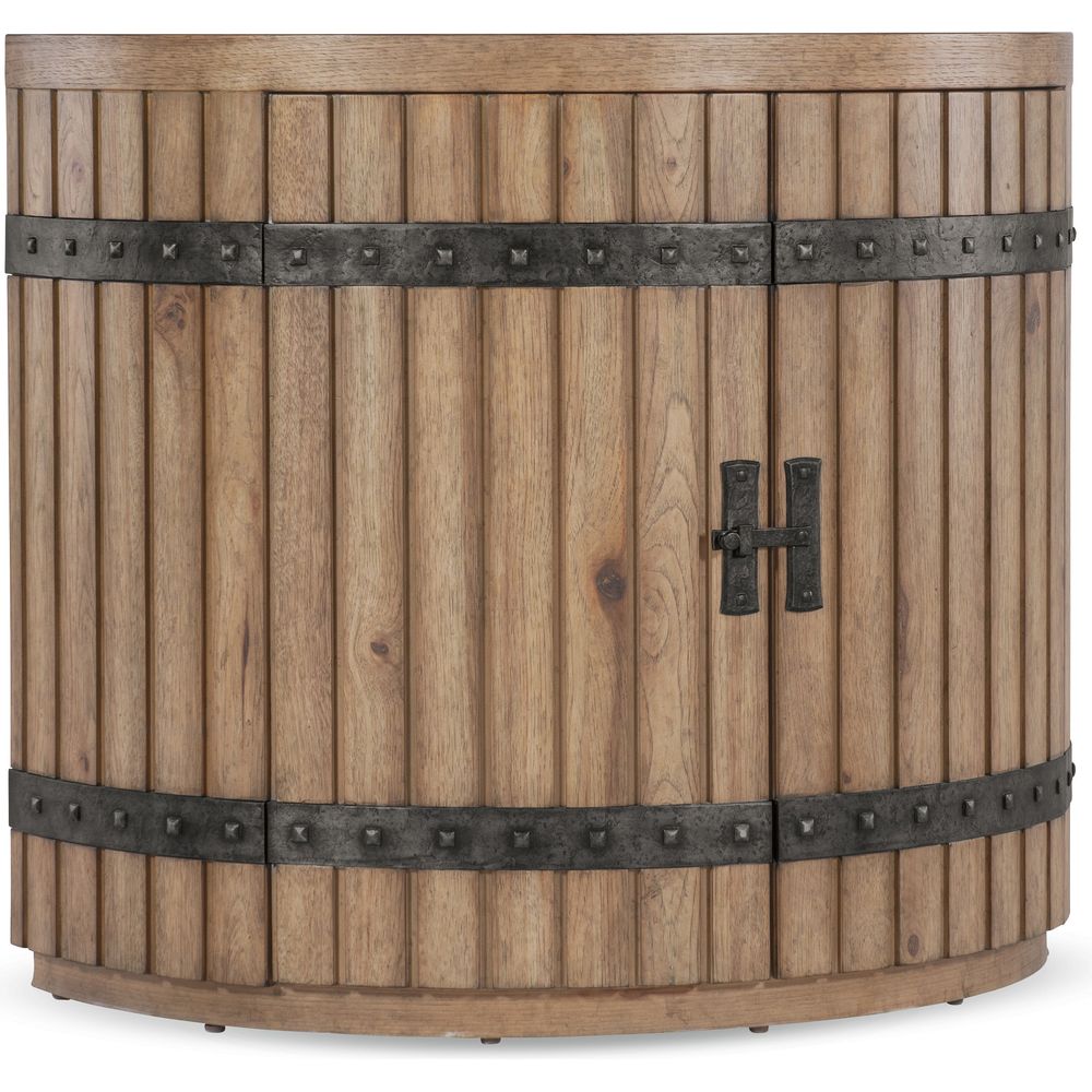 Features: Two doors have soft close hinges and magnetic door catches; Two adjustable wood shelves; Half circle shape; Wine barrel design; Rustic, hammered metal accents