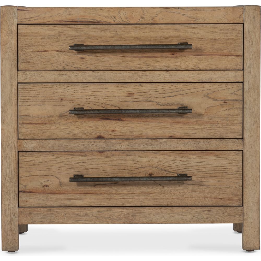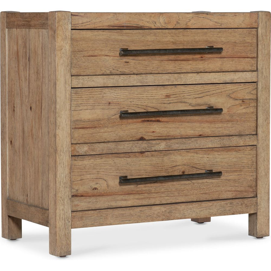 Description: Embracing the rustic charm and organic aesthetic of the Napa Valley, the Vineyard Row Two-Drawer Nightstand is crafted of Pecky Hickory and White Oak Veneers and finished in the light and airy Sonoma, reminiscent of the crisp white wines of the Sonoma region. Accented by rustic hammered bar pulls, there are 3 self-closing drawers, and the top drawer has a removable black felt liner.