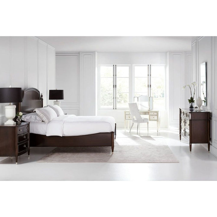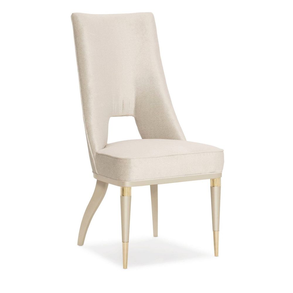 Everyone will feel like your Guest of Honor when you invite them to dine and relax in the comfort of this fabulous upholstered dining chair. Its tall, contemporized back is expertly tailored in a luxe neutral fabric and features a lower peek-through opening that creates instant drama. A shimmering Soft Radiance finish highlights its two unique leg styles lending a touch of glimmer beautifully reflected in candlelight or an overhead chandelier. Like bold jewelry, metal collars and ferrules in plated Whisper of Gold accentuate each front leg to complete the ensemble.