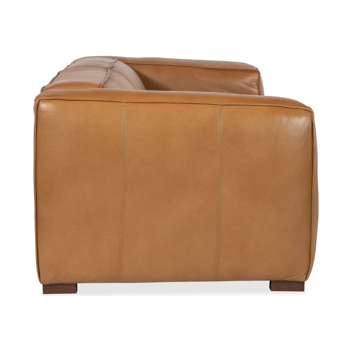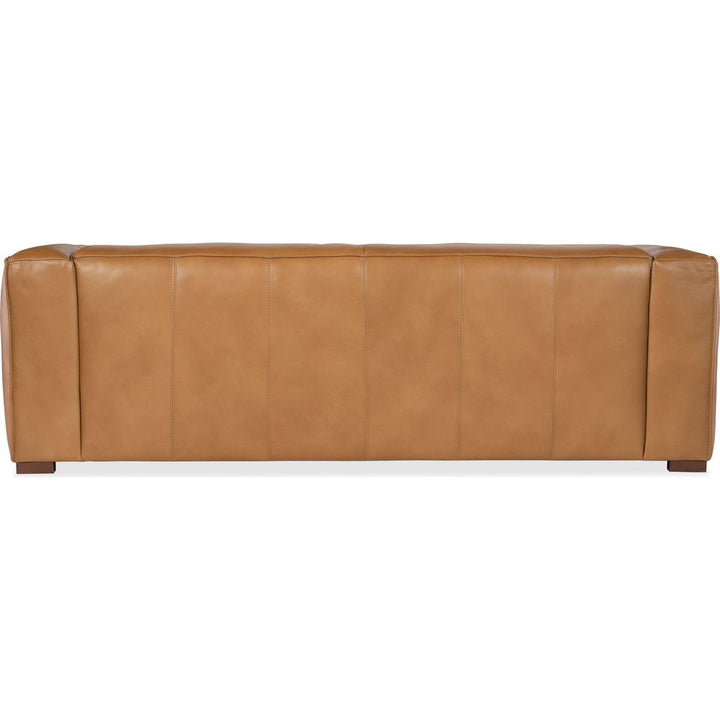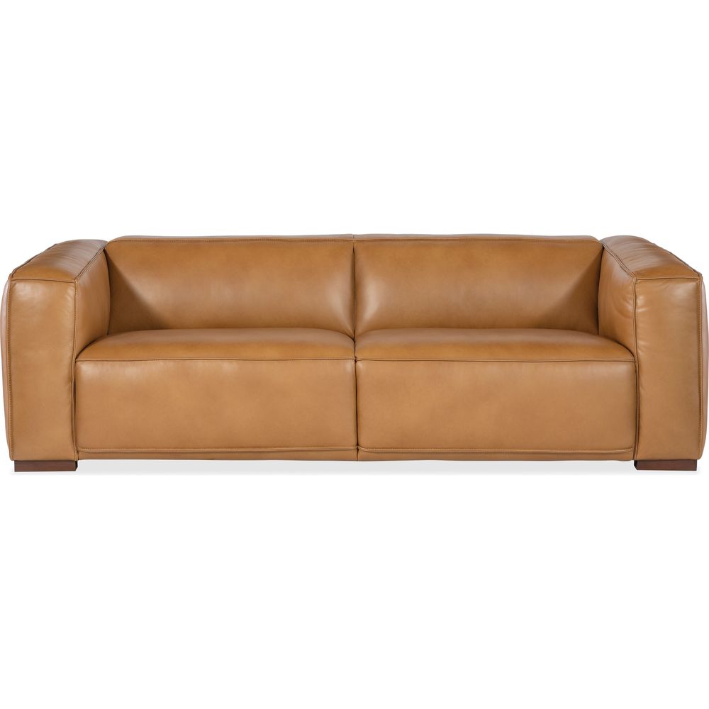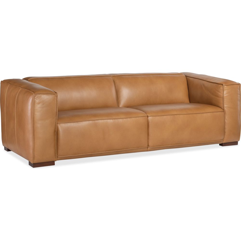 Description: A sleek, low-profile silhouette with wide track arms, wood block feet and flange welt trim are paired with a warm and inviting caramel-colored luxurious semi-aniline leather cover in the 95-inch wide Vista two-seat Sofa.