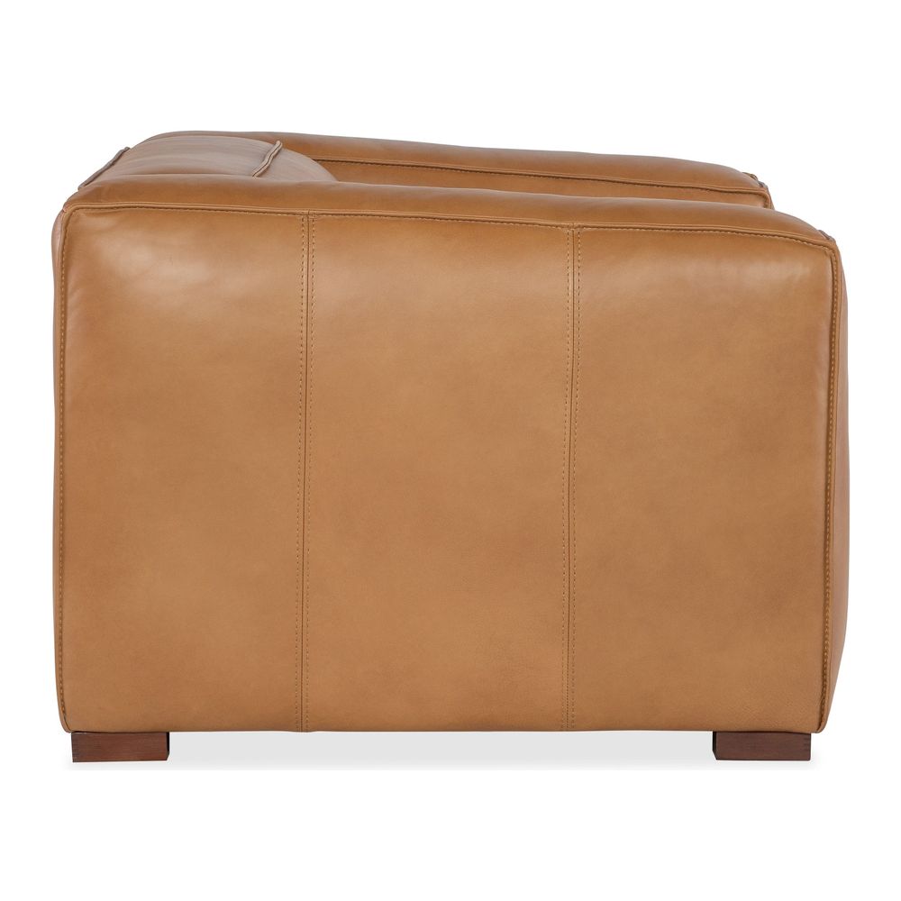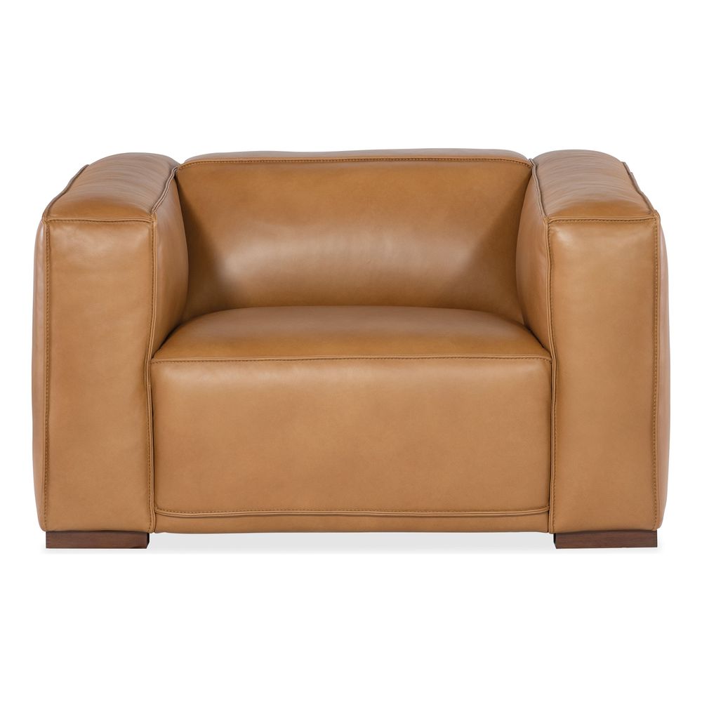 Description: The Vista chair pairs a sleek, low-profile silhouette with wide track arms, wood block feet and flange welt trim with a warm and inviting caramel-colored luxurious semi-aniline leather cover.