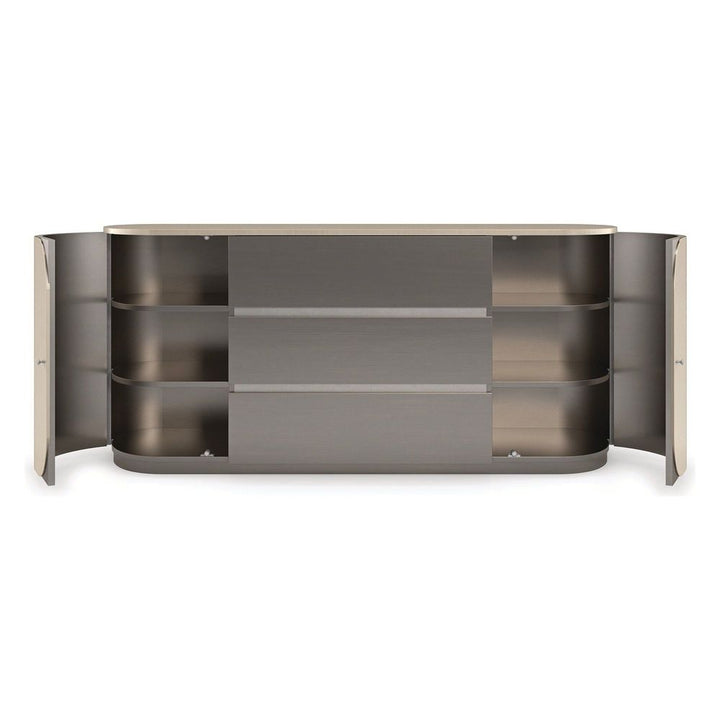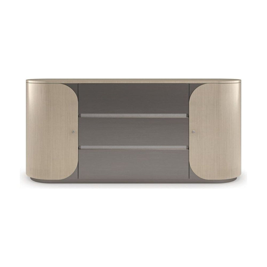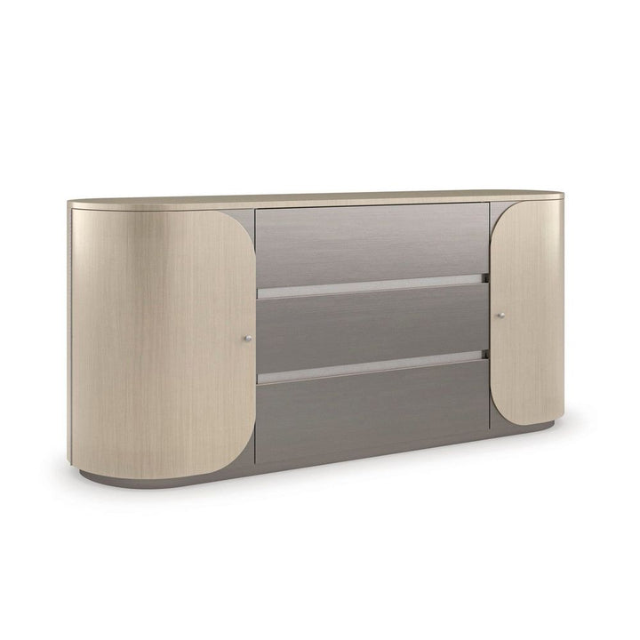 With clean lines and curves beautifully balanced by a monochromatic palette, this oval-shaped dresser introduces a sleek, Italian modern aesthetic to bedroom interiors. Smoked Stainless Steel painted drawers lend subtle contrast to rounded doors in a Thunder finished veneer that punctuates the wood grain. Minimalist metal hardware finishes the look, for a streamlined design with abundant storage potential, including three soft-close drawers and two adjustable shelves behind each door.