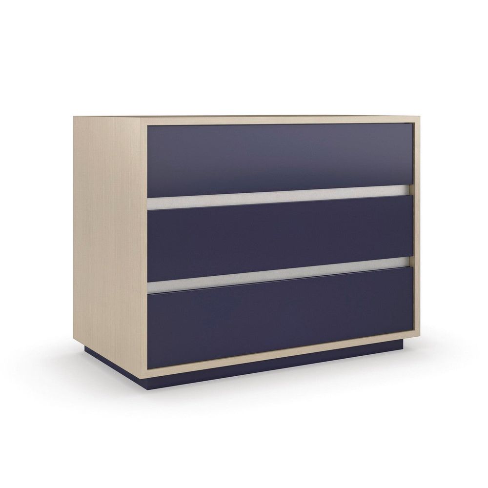 A streamlined style with Italian modern inspiration, this large nightstand makes a bold bedside statement. Finished in Thunder to showcase the natural wood grain, its linear design is accentuated by drawer fronts in a Prussian Blue hue. Three soft-close drawers offer generous storage, with a USB port on the back for discreetly charging your smartphone, laptop, and other devices.