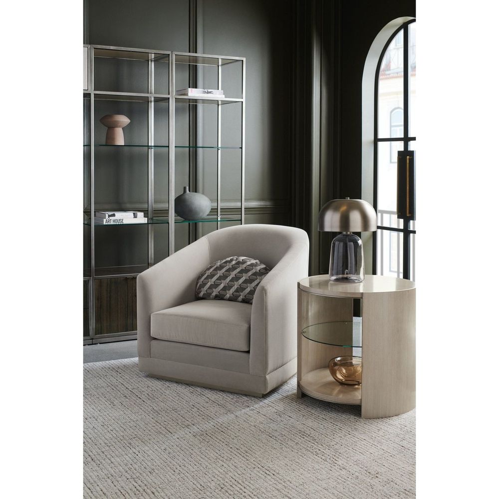 A softly rounded form with an exquisite finish, this end table makes a captivating addition to living interiors. Open at the center for storage and display, its sculptural shape is accentuated by a linear wood grain and Soft Silver paint. Features an adjustable glass shelf that lets your unique style take center stage. Well-scaled to use on either side of a sofa, or alongside a statement chair.