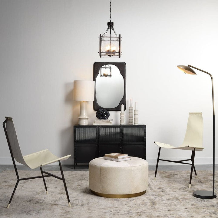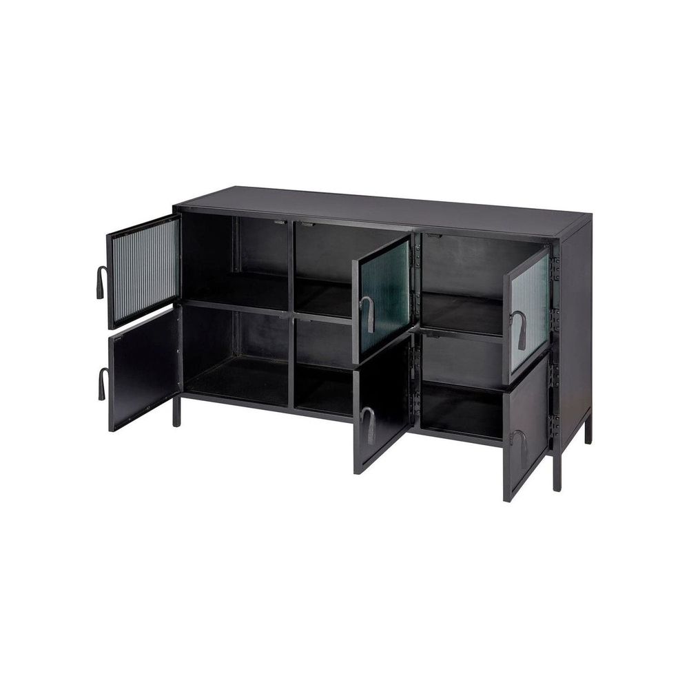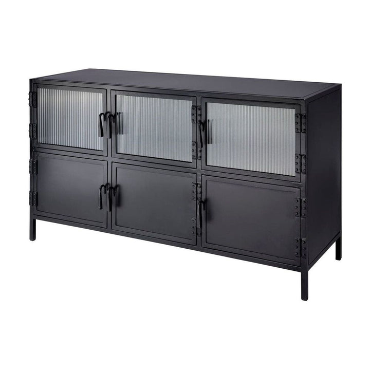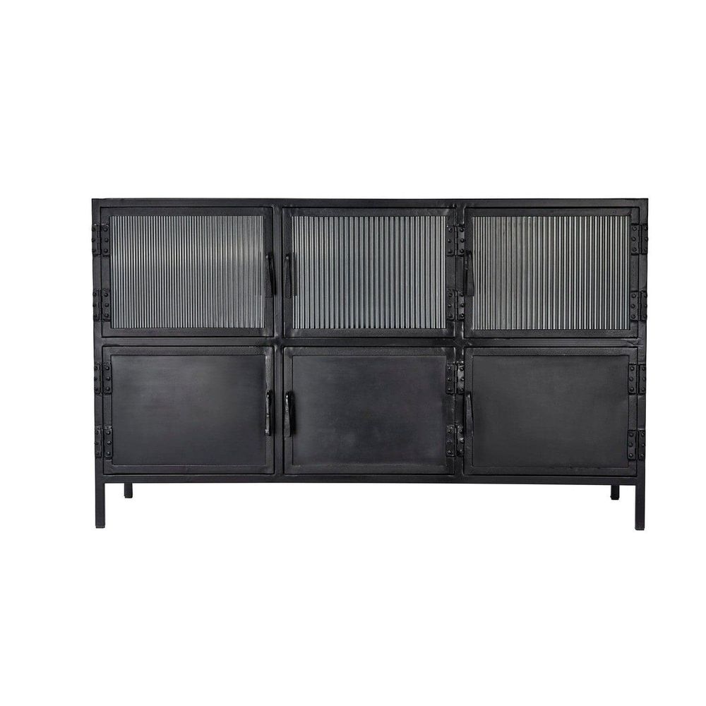 With an abundance of storage and tons of style, this industrial-edged console is ideal for an urban, contemporary decor. Handcrafted of minimally finished black metal, its six doors open to reveal ample cupboard space and one fixed shelf. Three of the doors are in a richly textural ribbed glass. The bottom three are solid metal. All six open easily with hand-forged iron pulls.