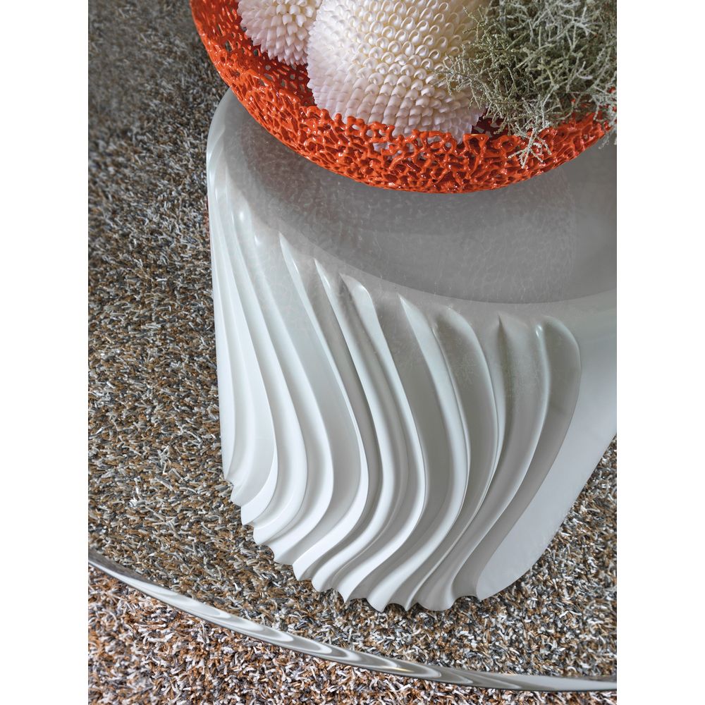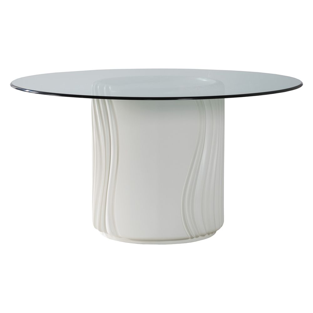 Feature 1: Drawn by one artist and carved by a second, this stunning casted drum base features sculpted compound curves vertically carved into a smooth drum in a nearly matte soft white with a hint of ivory. We have paired with our 56-inch glass top.