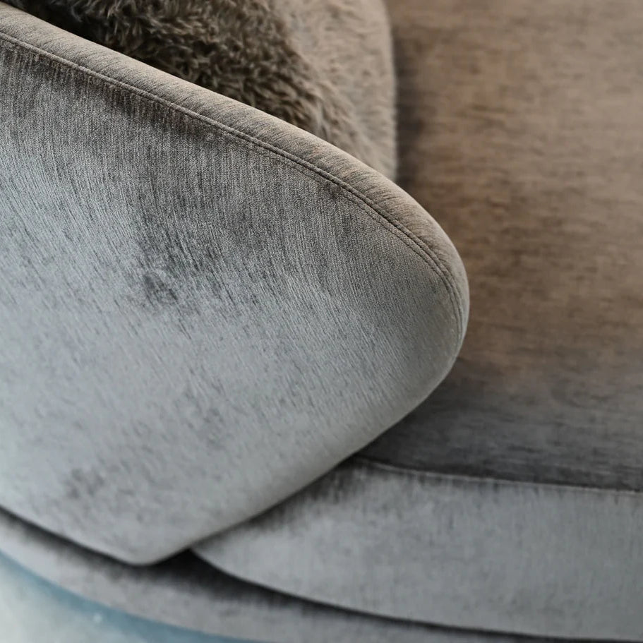 The Voltaire chair and half fits up to 2 people comfortably. The perfect lounge chair for a reading nook or bedroom. This piece is upholstered in a luxurious chenille fabric in mocha bean with a delightful mix of toss cushions capturing an essence of playful elegance. The Voltaire Collection also features a modular sectional, allowing you to create a picture perfect living space.