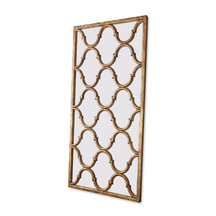 Explore your space with the versatile Voltis Mirror. Crafted with clear mindi wood and a timeless antique wire brush gold finish, this oversized piece adds elegance to any room. Thanks to the metal cleat included, you can hang it vertically or horizontally to suit your needs.
