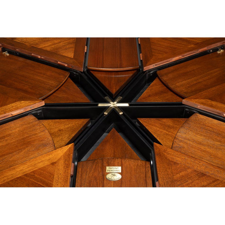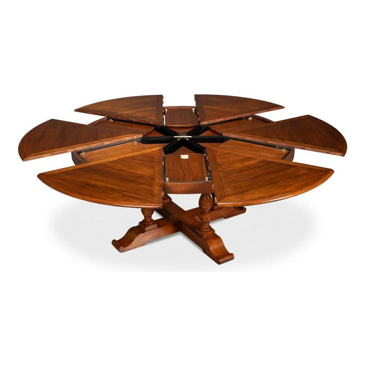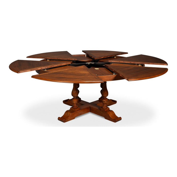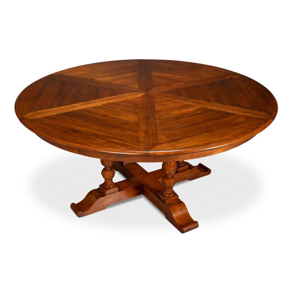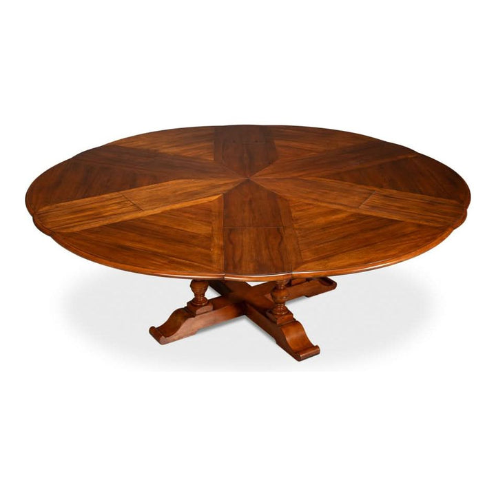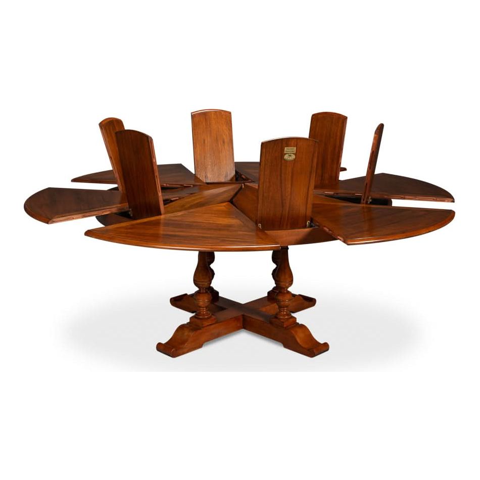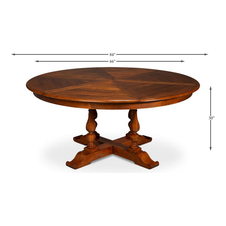 The Walnut Jupe Table is crafted with a sophisticated farmhouse patterned top and is supported on four turned wood uprights leading to the trestle style base. Sarreid"s newly reengineered Jupe Dining Tables bring a timeless 19th-century innovation into the modern age. Featuring a self-storing expansion mechanism crafted from extruded aluminum, these tables expand effortlessly, providing both smooth operation and simplified assembly.