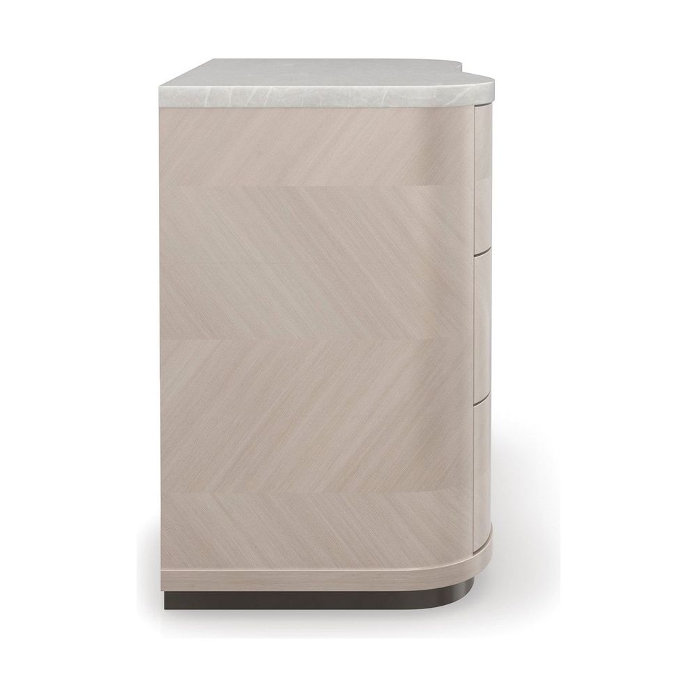 Balanced on a clean plinth base, this large-scale nightstand introduces a sleek and sinuous form with organic simplicity. Chevron-patterned Koto veneers in a Moonstone finish highlight its fluidity, defined by three gently curving, soft-close drawers with horizontal hardware in Deep Bronze. A White Rhino marble top adds a touch of luxe and a durable top surface for nighttime reads and bedside essentials.