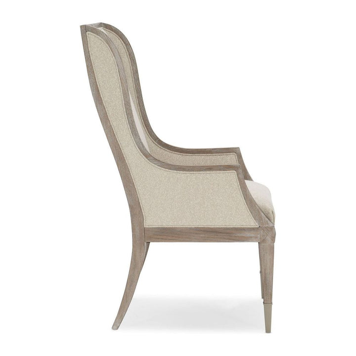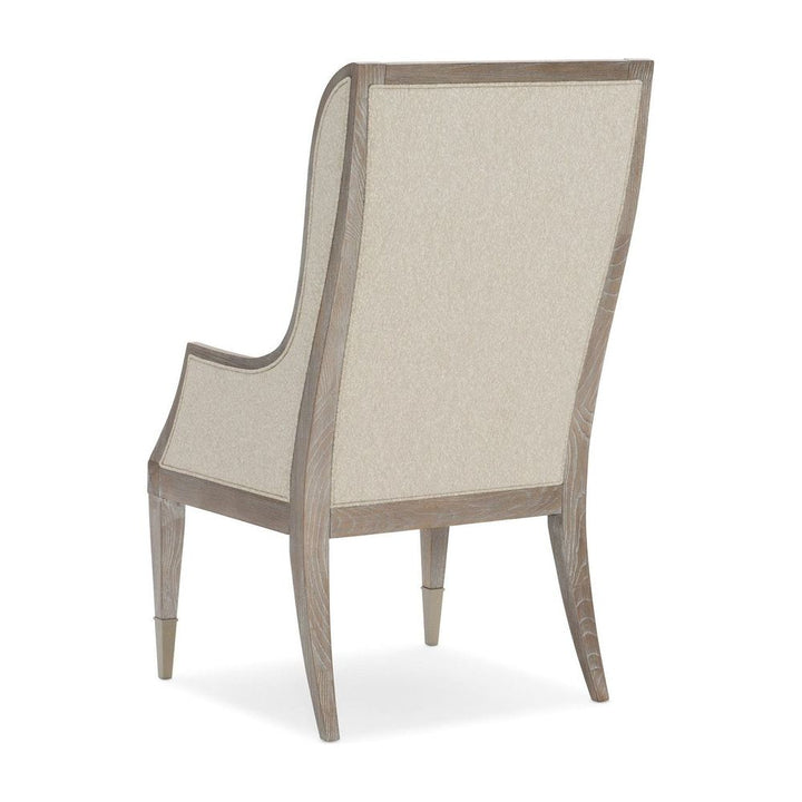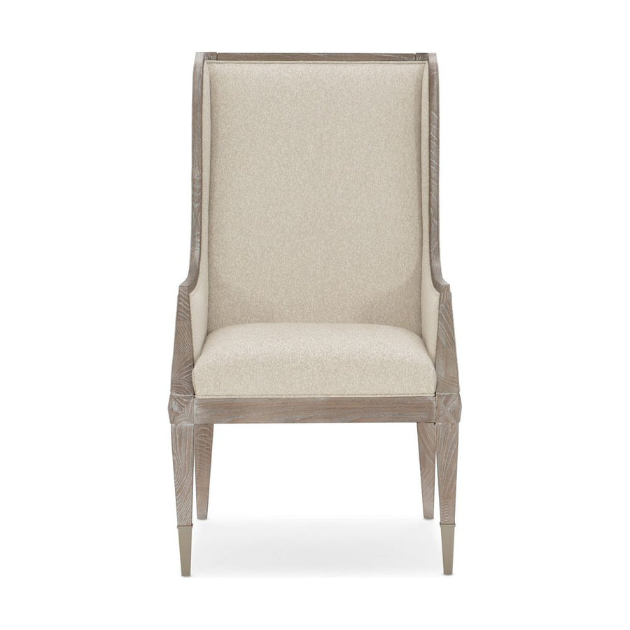 A handsome addition at any table, the Open Arms Arm Chair elevates every dining experience. Its timeless silhouette is brought to life in a casually elegant Ash Driftwood finish and complemented with a finely tailored, luxe fabric cover in an elegant neutral shade. Easygoing at heart, the fine lines of this fully upholstered chair render it perfect for the host and hostess. Metal ferrules in Sundance Gold cap each front leg for a touch of bling.