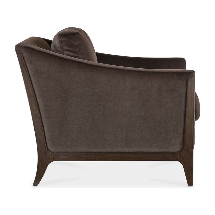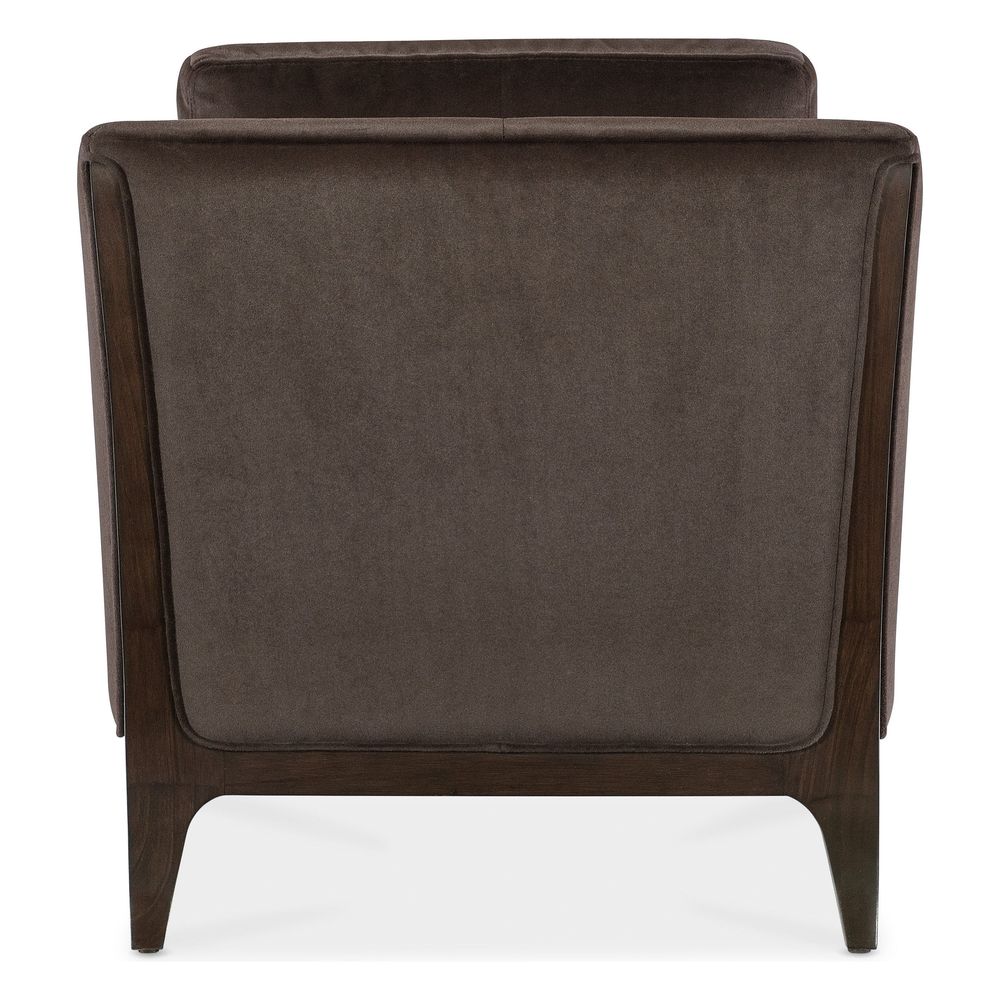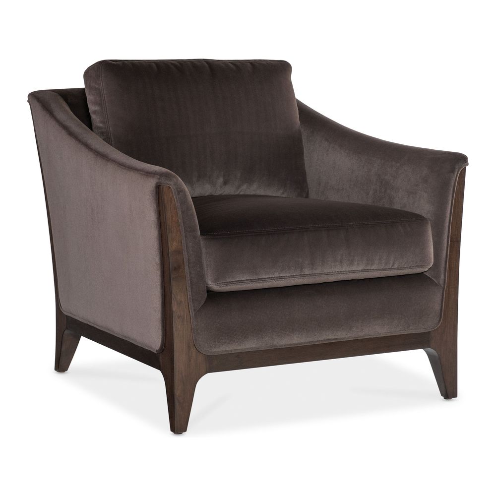 Description: In a sultry color combination and inviting style, the Sophia Chair combines the Merrimac Mink plush velvet upholstery with the deep translucent Caviar finish on the wood legs and frame, crafted of rich Cathedral Cherry Veneers. Topstitch and welt trim add a designer touch.