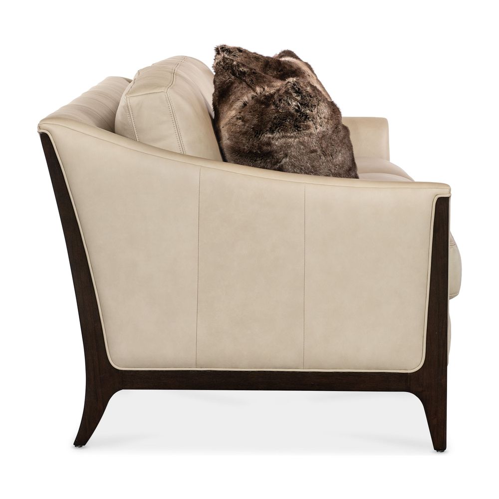 Description: The epitome of mid-century elegance with an updated design, the Sophia Sofa has flared wood legs and frame finished in the deep translucent tone of Caviar on rich Cathedral Cherry Veneers. Sophia is upholstered in the luxurious Aline Stonewash semi-aniline leather with topstitch and welt trim, complemented by two 19-inch fluffy accent pillows in the Full Moon Timber fabric.