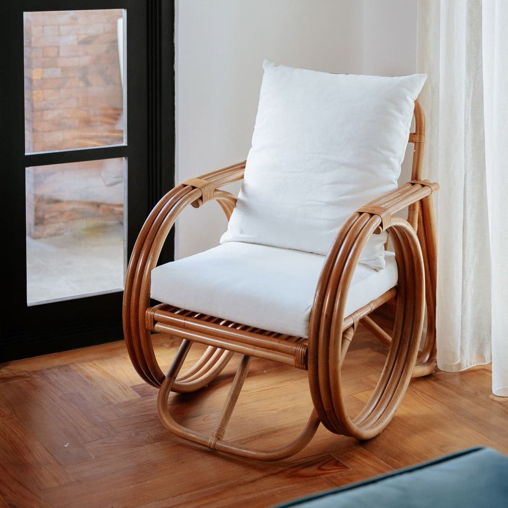 This one-of-a-kind chair is an excellent enhancement to any sitting area. The curved rattan frame offers ample support while maintaining an airy and open design. The cushioned upholstery guarantees a comfortable seating experience.