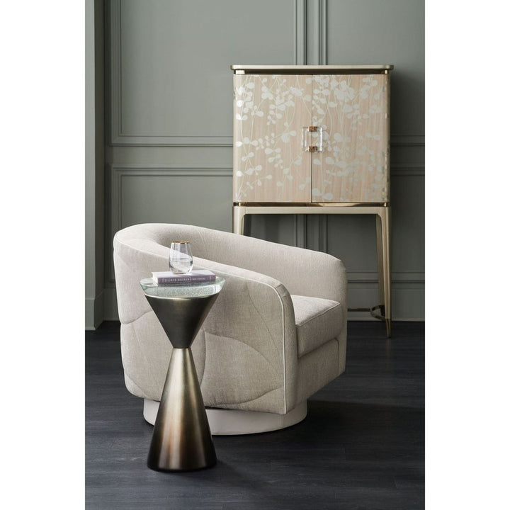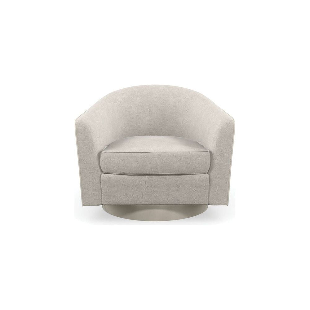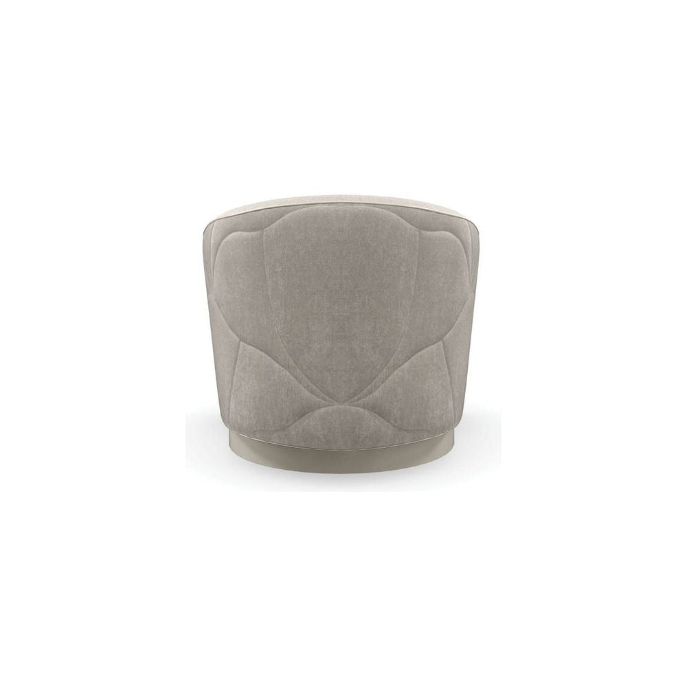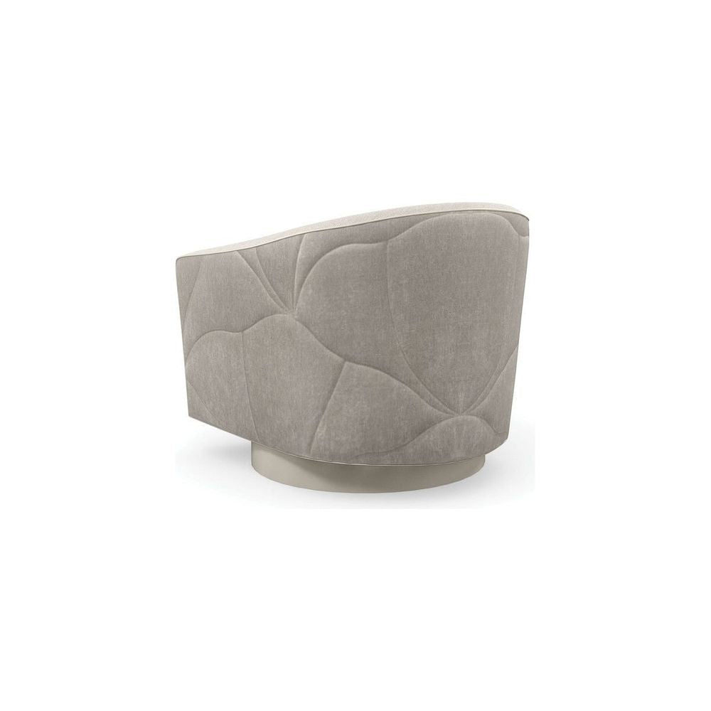 An all-around standout, this softly curved swivel chair introduces a free-flowing, organic style to seating areas. A quilted ginkgo leaf pattern fanning out along the back creates repetition and subtle movement, accented by a cream-colored contrast welt and plinth base wrapped in pearl vinyl. Expertly tailored in tonal gray performance fabrics, inside and out, for a look of luxury that's also livable. Makes a statement on its own, even more dramatic in pairs.