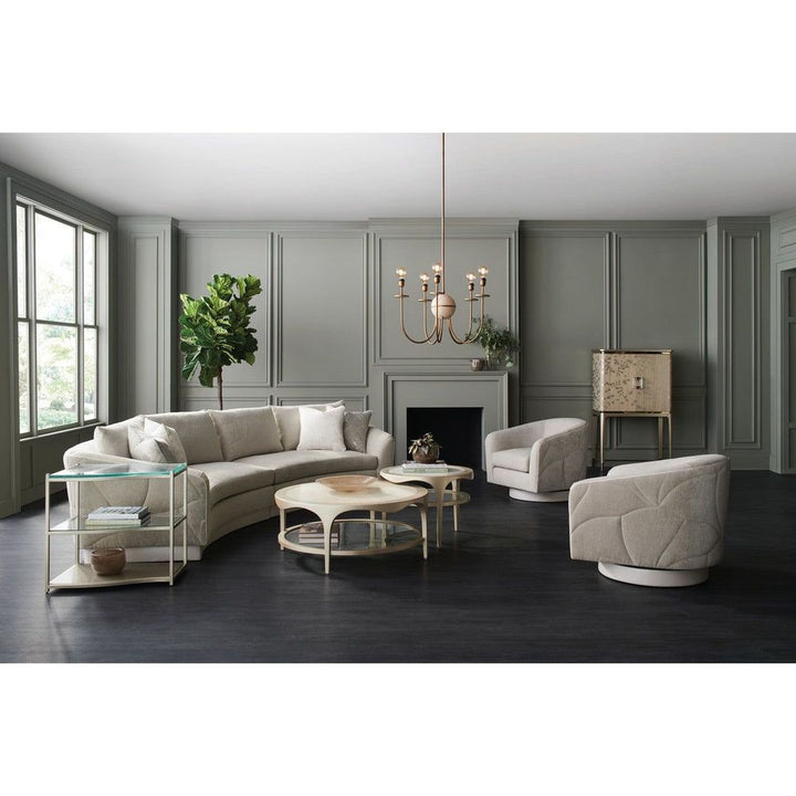 Free-flowing and organic, Fanciful's soft curves are artfully accented by a quilted ginkgo leaf pattern, fanning out along the back and sides. Its nature-inspired design adds graphic interest and dimension, complemented by a curved plinth base wrapped in pearl vinyl. Expertly tailored in tonal gray performance fabrics, inside and out, and trimmed in contrast welt. For a finishing touch, we've added accent pillows in soothing neutral hues and a subtle pattern. Pair with the matching Fanciful swivel chair.