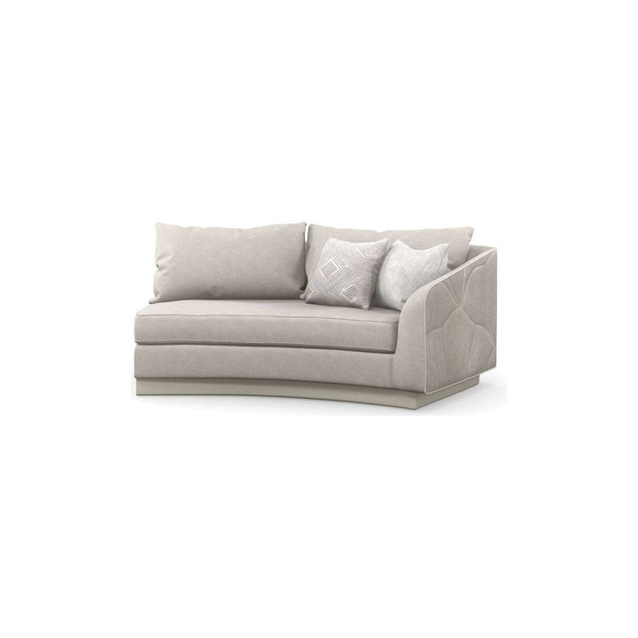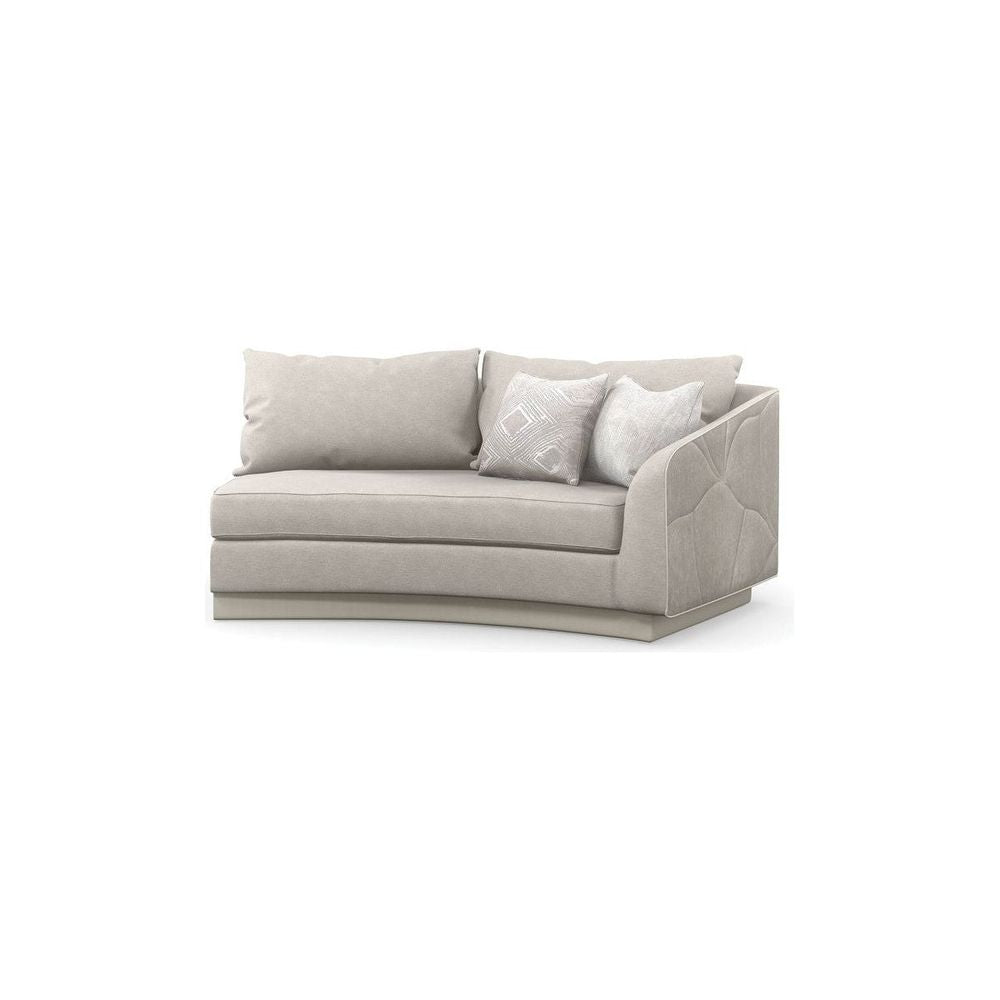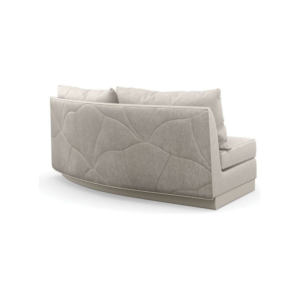 Free-flowing and organic, Fanciful's soft curves are artfully accented by a quilted ginkgo leaf pattern, fanning out along the back and sides. Its nature-inspired design adds graphic interest and dimension, complemented by a curved plinth base wrapped in pearl vinyl. Expertly tailored in tonal gray performance fabrics, inside and out, and trimmed in contrast welt. For a finishing touch, we've added accent pillows in soothing neutral hues and a subtle pattern. Pair with the matching Fanciful swivel chair.