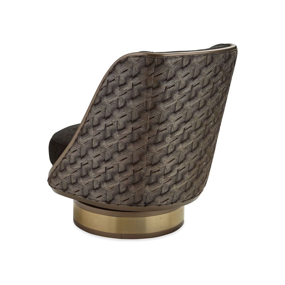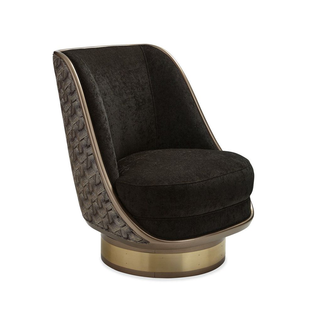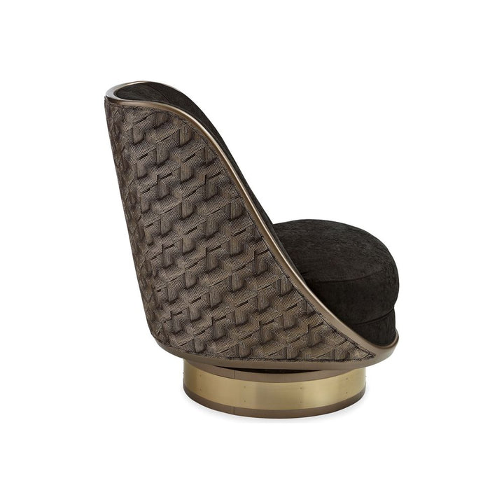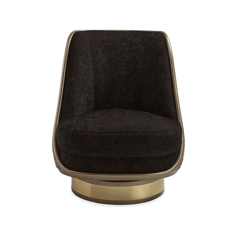 Expressing your unique perspective is easy with this sublime swivel chair. Bold in its every detail, it features a barrel base finished in Harvest Bronze with a Champagne Gold metal wrap. Two luxe fabrics are combined to masterful effect while a painted wood trim creates a pencil rail outlining its shapely silhouette. Its interior is upholstered in a plush espresso chenille while its exterior is impeccably tailored in a textural geometric pattern highlighted with gold metallic yarns. Perfect on its own or paired together for visual impact, this chair represents the essence of Art Deco modernized for today's lifestyles.