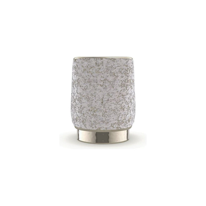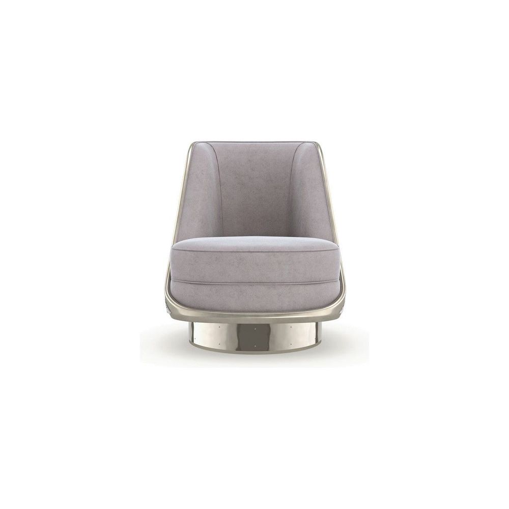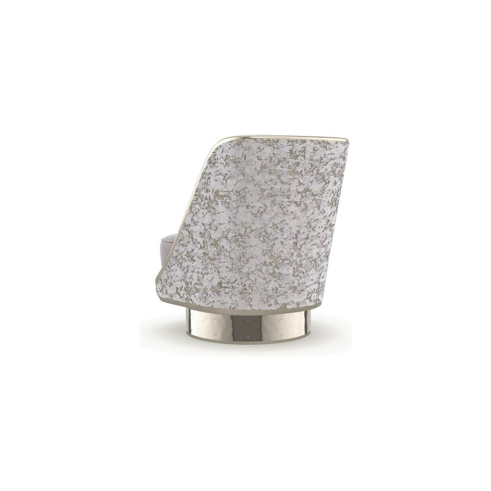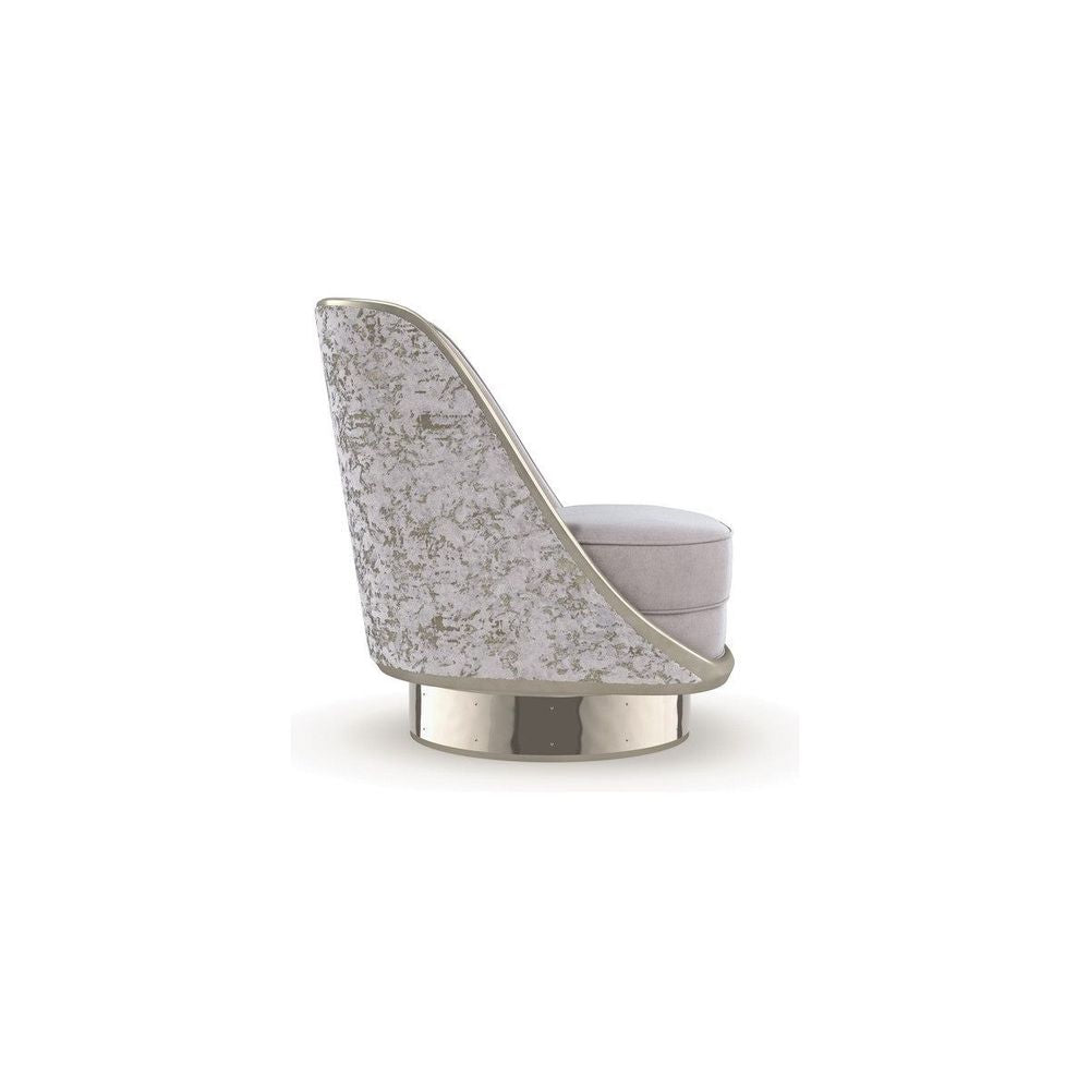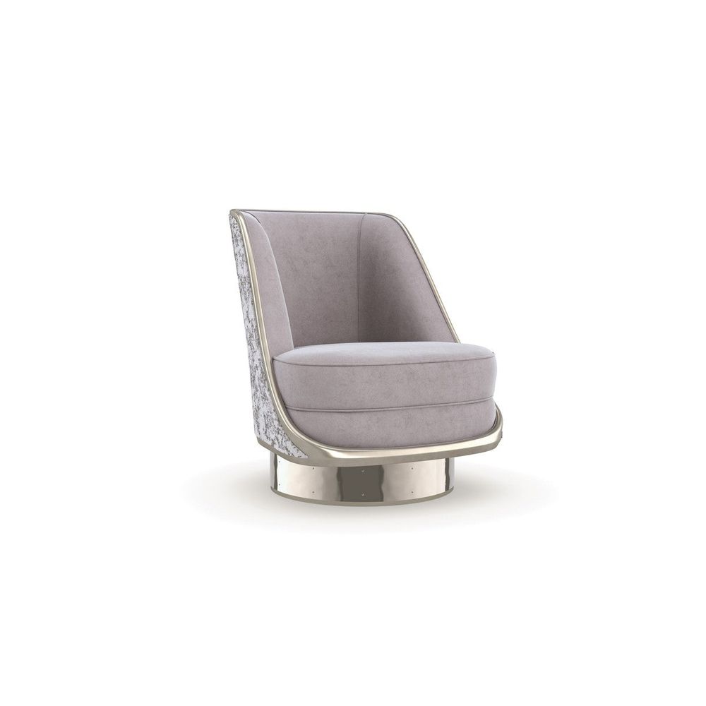 Svelte and sophisticated on a gold metal banded base, this swivel chair epitomizes the essence of glamour. Its softly contoured silhouette beckons to be admired in a luxurious mix of materials and finishes. A contrasting cut velvet wrapping the back adds a classic detail, complemented by a pale gray lavender velvet on the inside and a shimmering Silver Shadow finish. Makes an alluring statement on its own, even more dramatic in pairs.