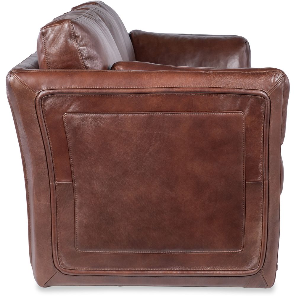 Description: Impeccably tailored and beautifully scaled, the timeless Woodstock 3-over-3 Sofa has an inviting flared arm design and an accent pillow at each arm, along with an accent panel on the front rail, sides and back. The sofa is upholstered in the Truffle semi-aniline top grain leather.