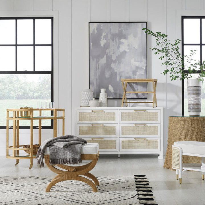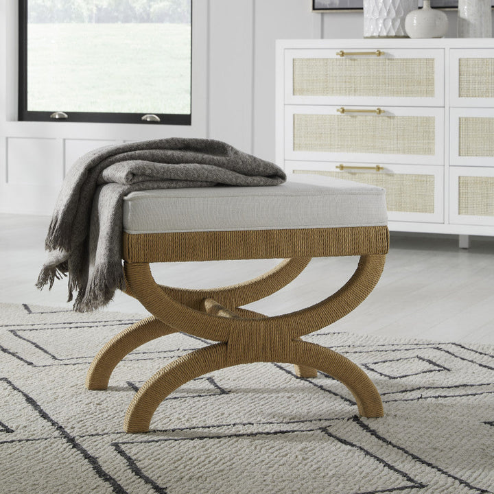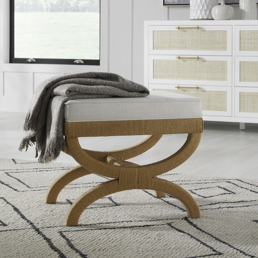 Description: The Neoclassical Xanadu stool blends a thoughtful combination of organic and modern design elements. Handcrafted with natural rope and topped with a structured white performance linen cushion|Xanadu looks great as standalone or bunched in pairs. 22" W X 19" H X 18" D