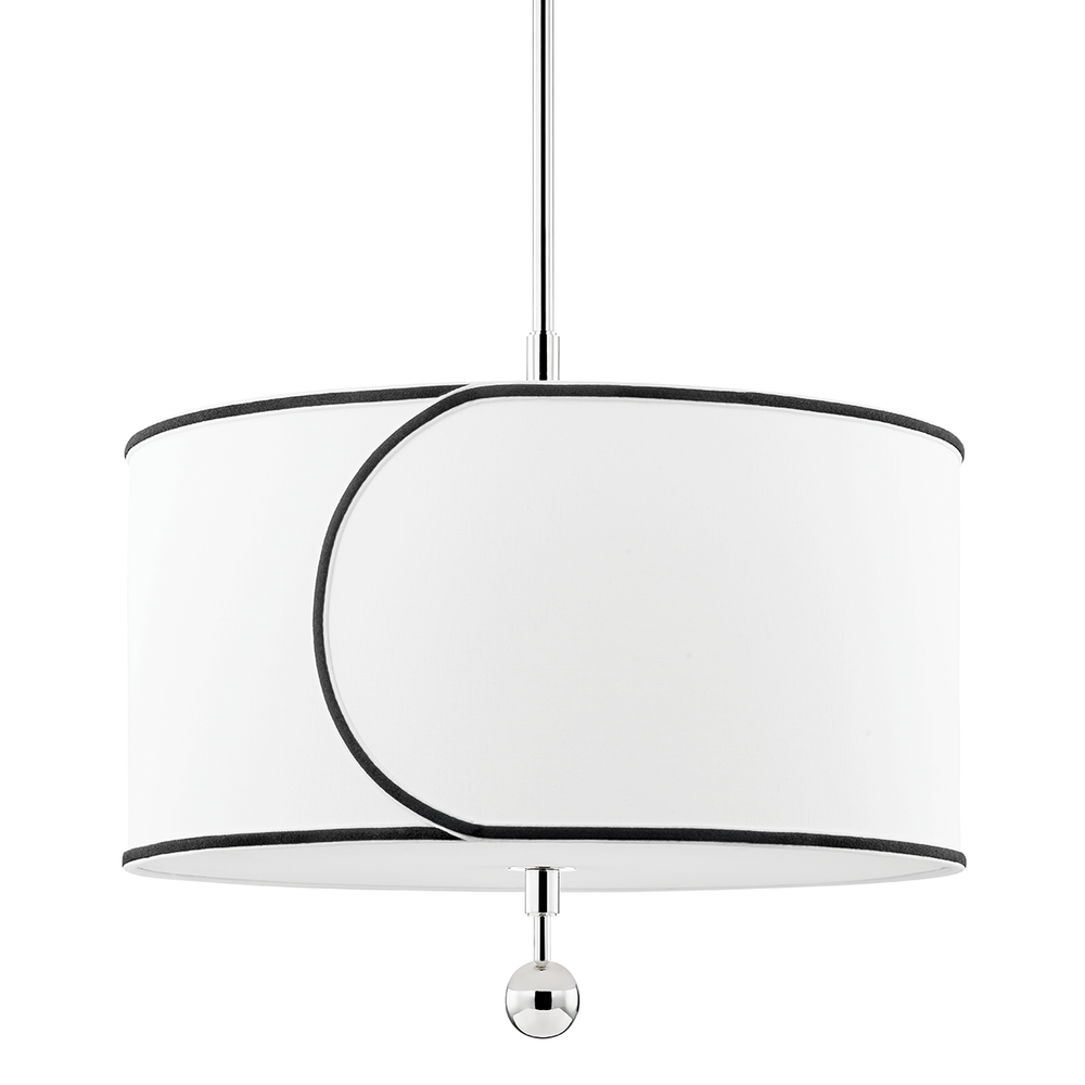 A classic reimagined, this white, Belgian-linen drum shade with black trim has an overlapping design that marches to its own beat. A metal finial in Aged Brass or Polished Nickel finishes off the clean look. Available as a flush mount, one- or three-light pendant or five-light linear.