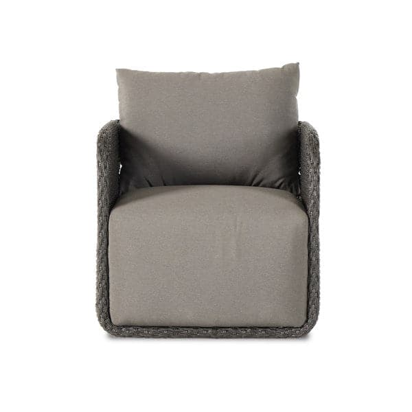 Work some texture into your outdoor styling. Charcoal all-weather wicker shapes a wraparound frame with rear cutout detailing, finished with a 360 swivel. Thick and durable, light grey seating makes this whole outdoor swivel chair modern and monochromatic. Cover or store indoors during inclement weather and when not in use.